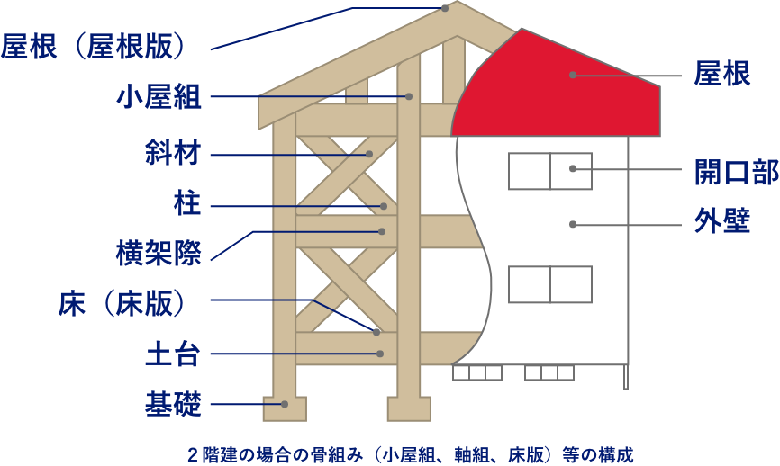 ■外壁のひび割れ、欠損、はがれ、サッシの周辺の隙間、開閉不良 ■柱及び梁の劣化、傾斜 ■バルコニのひび割れ、劣化 ■土台のひび割れ、劣化 ■床の著しい沈み、傾斜 ■基礎のひび割れ、欠損、劣化 ■屋根のひび割れ、劣化、はがれ ■軒裏(シーリング材の破断、欠損、軒裏天井の雨漏りの跡 ■内壁と天井の雨漏りの跡